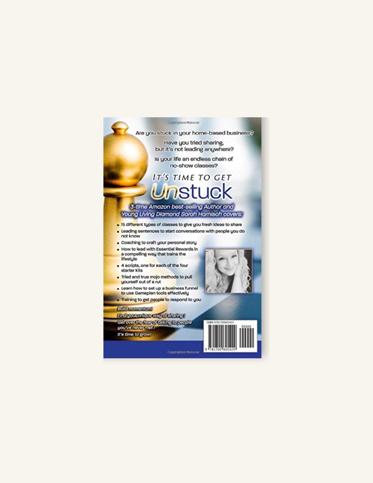 Are you stuck in your home-based business? Have you tried sharing, but it’s not leading anywhere? Is your life an endless chain of no’s? It’s time to get Unstuck. Three-time Amazon best-selling author and Young Living Diamond Sarah Harnisch covers:-15 different types of classes to give you fresh ideas to share-Leading sentences to start conversations with people you do not know-Coaching to craft your personal story-4 scripts, one for each of the four starter kits-Tried and true mojo methods to pull yourself out of a rut-Learn how to set up a business funnel-The art of listening-Leading sentences that start conversations-How to collect contact information from total strangers-How to tap into friends of friends-Closing in a way that leads to sales-How to find new people for your business-Training to get people to respond to you-How to lead with Essential Rewards in a compelling way that trains the lifestyle-The words to stamp out fearBuild momentum! Find your unique way of sharing! Get over the fear of talking to people you’ve never met with specific action steps! It’s time to grow!This is the year you get Unstuck.